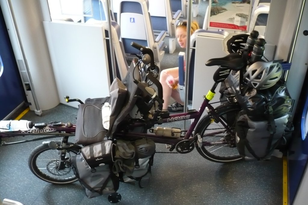 Ça rentre tout juste et les gens savent encore tourner autour. Il est fixé à l'arrière par des élastiques et cordelette au guidon, frein à main par collier belge.
